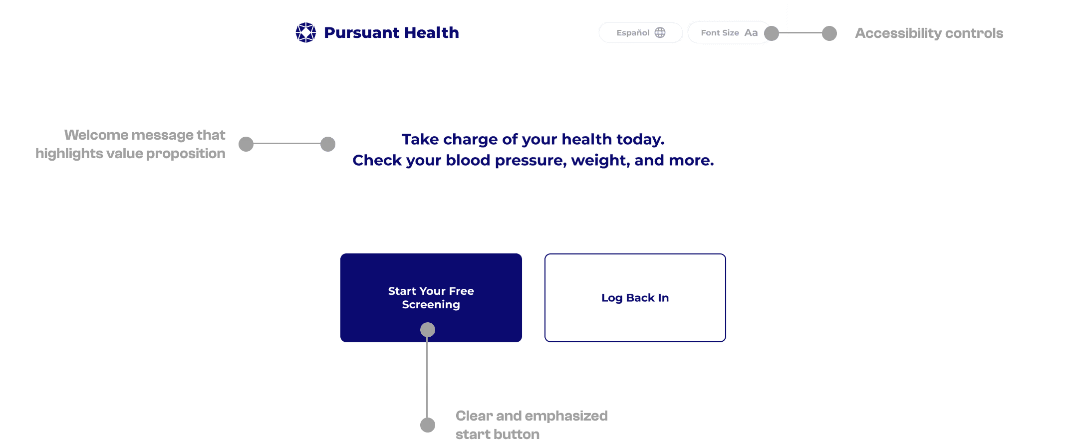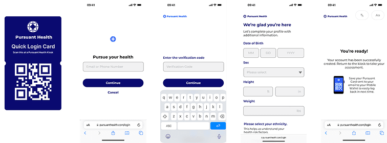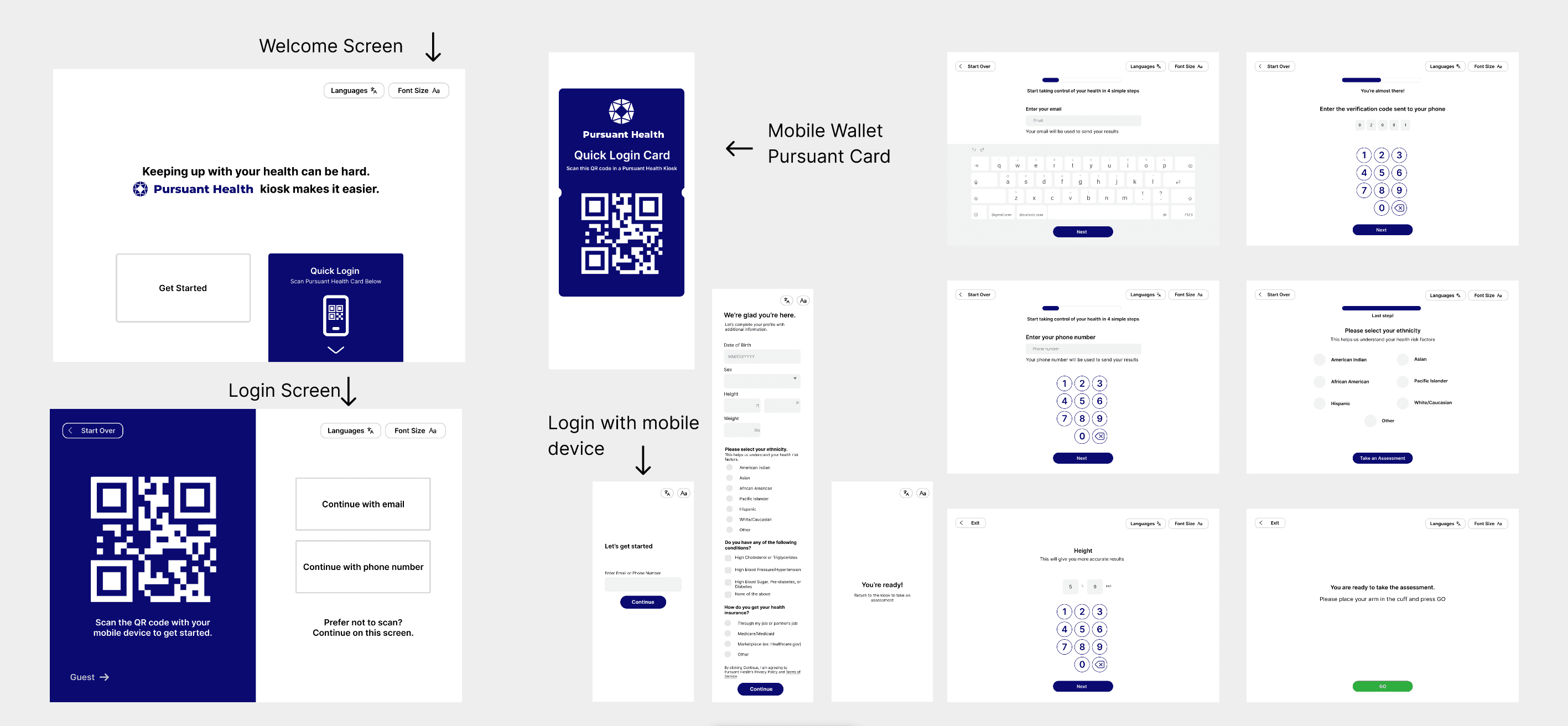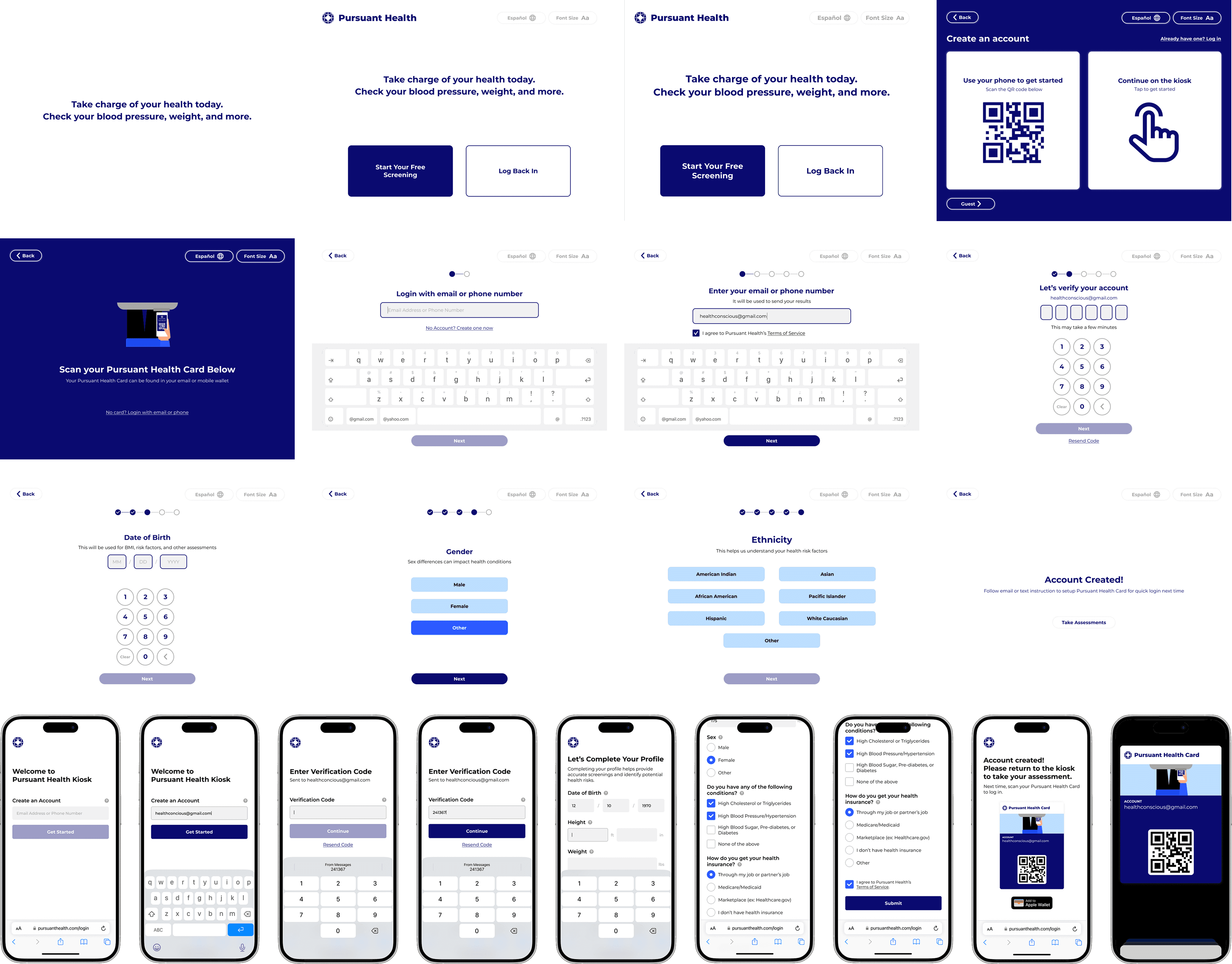The Pursuant Health Kiosk Redesign improves the onboarding and account creation experience for over 4,000 free health screening kiosk across United States. Through users research prototyping, and usability testing, we identified barriers like unclear instructions, low perceived value. and privacy concerns. The final redesign emphasizes clear benefits, flexible login options, and a smooth user flow to encourage account creation and user retention.