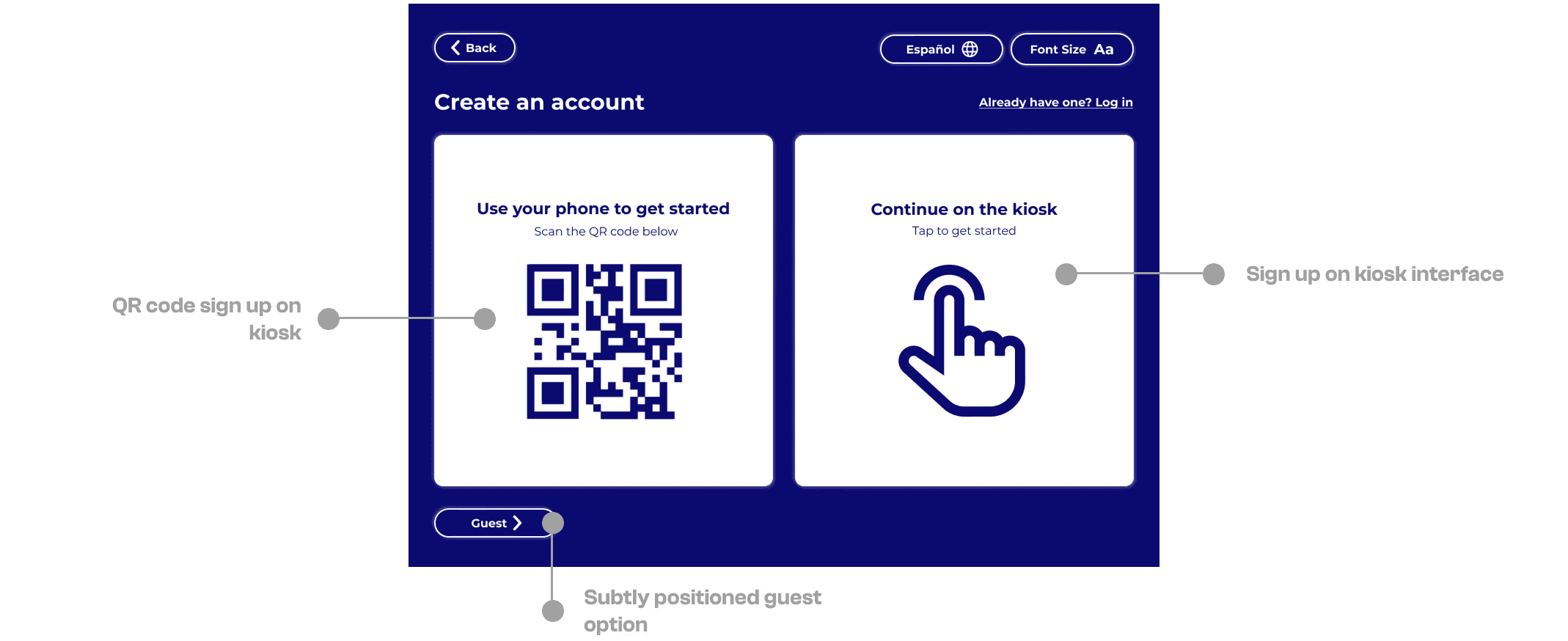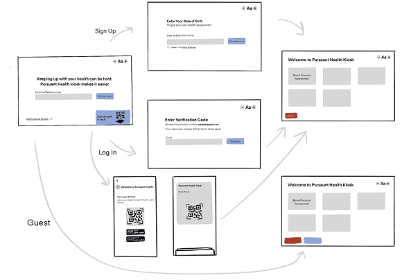 We received most positive feedback for the mobile wallet login feature and found that most users don't want to download an app for the kiosk. Using these findings, we created wireframes and conducted 3 more feedback sessions with users of varying levels of technological literacy.