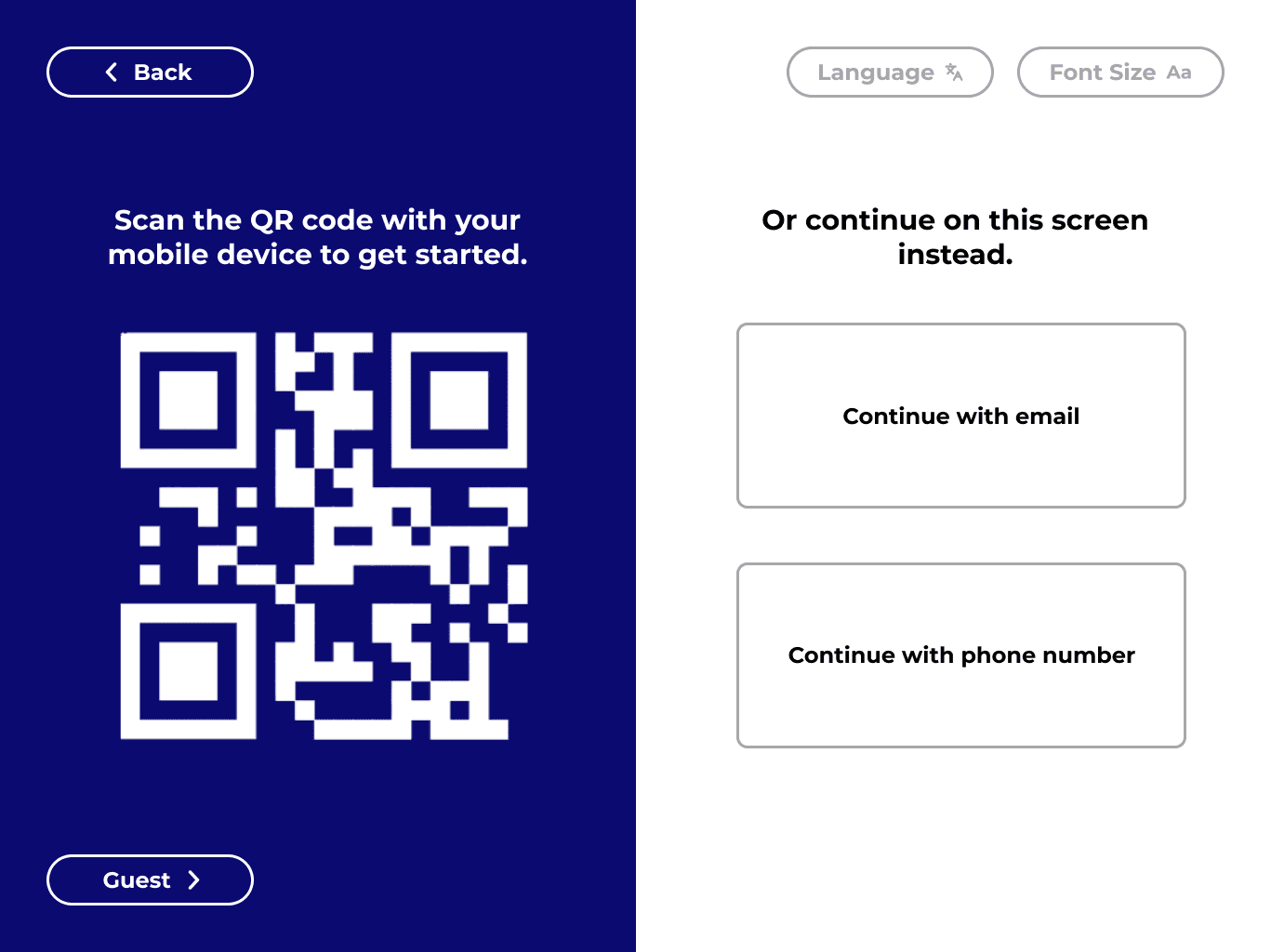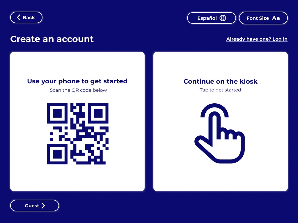 Users scan a kiosk QR code to complete the full account sign-up process securely on their personal mobile device via the web app.